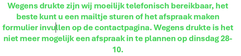 - Na uw afspraak aanvraag kijken wij in onze planning of het kan en bevestigen we de afspraak altijd per mail of telefonisch. Zonder onze bevestiging is de afspraak dus nog niet definitief. We reageren doorgaans binnen 24 uur. Wilt u sneller een afspraak, dan kunt u het beste even bellen.