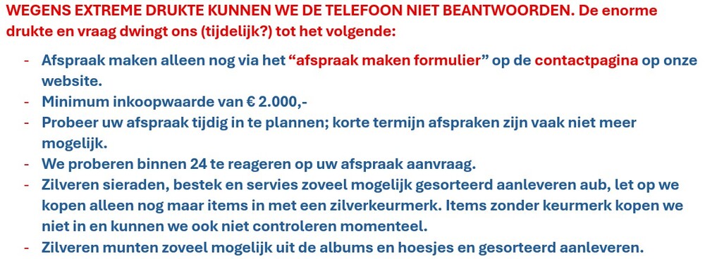 Onze inkoopprijzen altijd actueel en transparant, zo weet u altijd waar u aan toe bent. Onze prijzen zoals hier vermeld zijn ook werkelijk onze netto inkoopprijzen. Er worden geen kosten meer in rekening gebracht en er worden geen rare berekeningen toegepast. Geen verrassingen achteraf, u kunt zelf thuis al berekenen wat u van ons ontvangt voor uw goud en/of zilver. Daar staan we voor.
