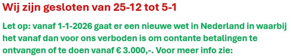 - De betaling doen we per directe bankoverboeking. Contant is eventueel mogelijk tot max € 3.000,- en vraag hier dan expliciet naar bij het maken van de afspraak.